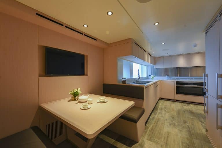 Der Crewbereich mit separater Küche und 3 Crewkabinen, um maximal 7 Crewmitglieder an Bord zu nehmen befindet sich mittschiffs.